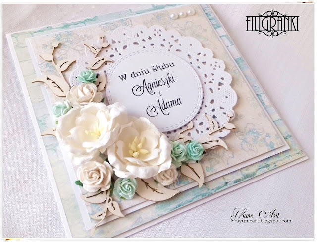 Today I'd like to show you a delicate, pastel wedding set. I used UHK Gallery papers. I completed flower composition with chipboard leaves. I made a few layers as always.