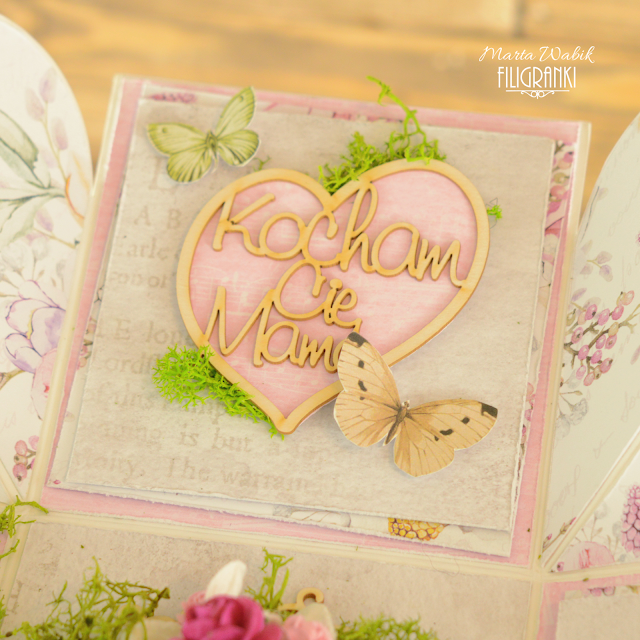 Niedługo Dzień Matki, z tej okazji przygotowałam wiosenny, radosny exploding box. Nie mogło zabraknąć oczywiście chrobotka, który jeszcze bardziej ożywił całą pracę.